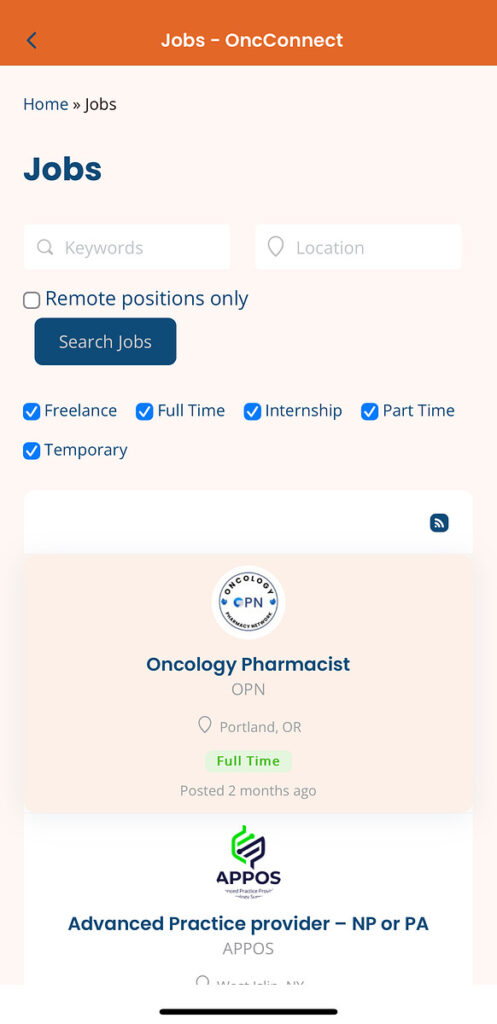 One of the newest features of OncConnect is the “Jobs” section specifically designed for clinicians working in oncology – hematology. Physicians, physician assistants, nurse practitioners, nurse specialists, pharmacists, nurses, and allied health professionals can use the OncConnect app to browse open positions, apply to jobs, and communicate with recruiters who have active job openings.